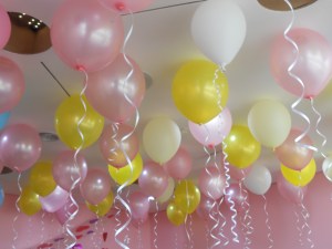 Imagine for a minute a room full of multi-colored helium balloons, trays of food the size of small cars, teddy bears large and small covering every surface of table and floor space, and more than a dozen happily combusting 6 year olds. And their mothers. Doesn’t that sound like Guy’s cup of tea?