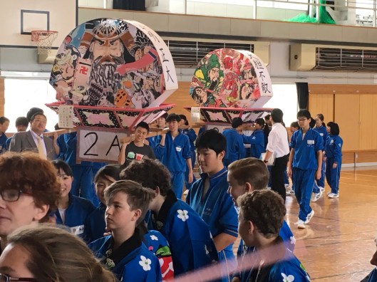 One of the activities we took part in was traditional painting of neputa floats (we practiced on paper). Afterwards, and because it was pouring rain outside, students created an indoor parade of miniature neputa floats made by the student body. They banged on large drums in a traditional rhythm and the crowd yelled “Yah, yah, doh!” as they do in Aomori at the annual neputa float parade. People from other areas of northern Japan have their own, different chant they yell.