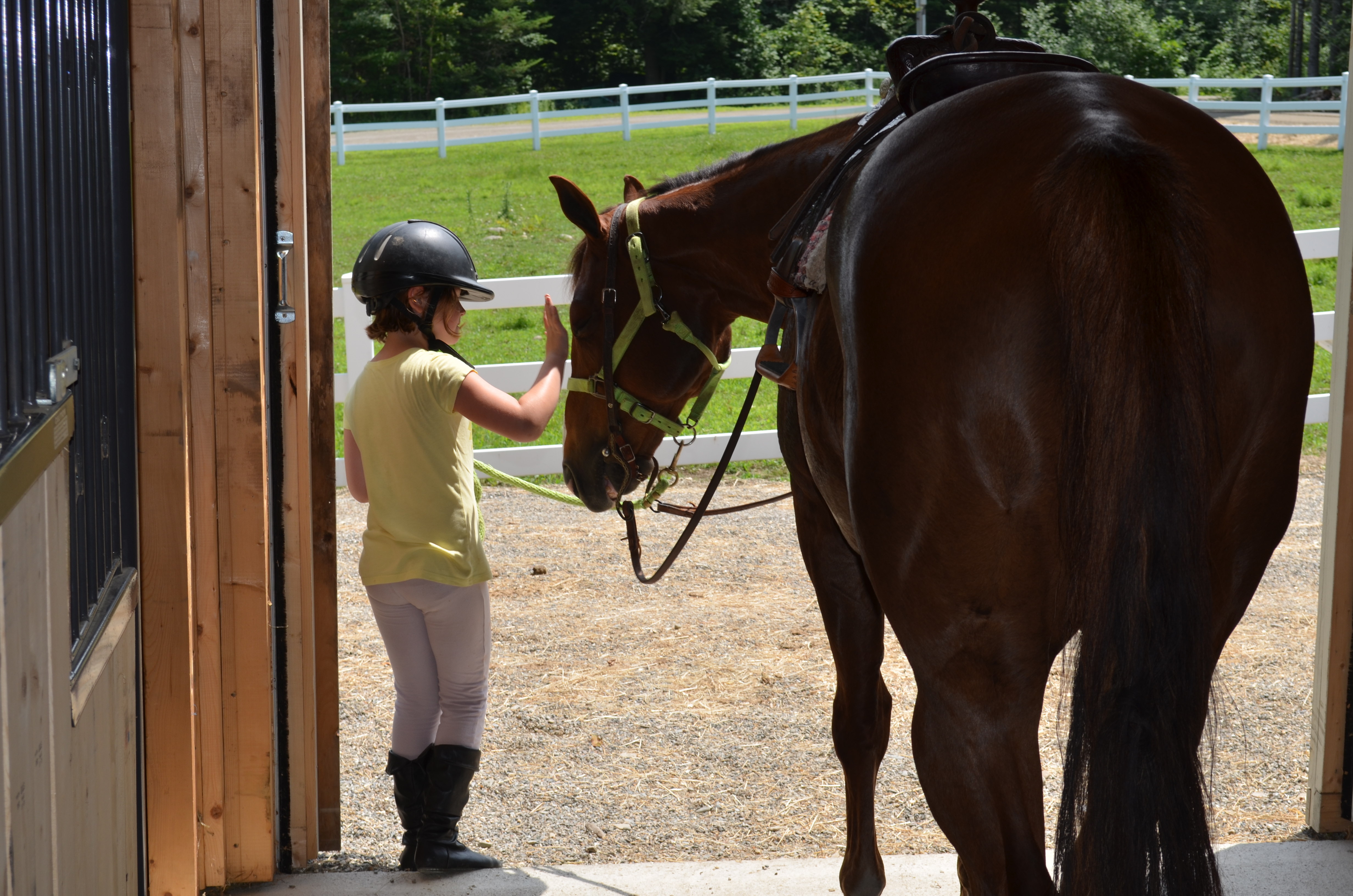 Here, in this pic above, off the horse, she was most comfortable. Grooming and petting are her thing. Riding, however, took her to the edge of her carefully carved out comfort space, and, sometimes, over. Can you hear the crack?